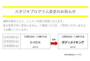 下記のスタジオプログラム内容に変更がございます。 ご確認いただき、ご参加くださいますようお願いいたします。