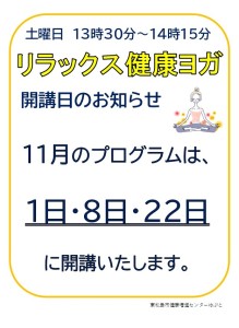 11月のリラックス健康ヨガは以下の日程で行います。 ご確認いただきご参加くださいますようお願いいたします。