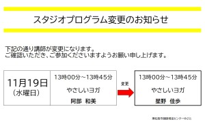 11月19日(水)スタジオプログラム講師変更のお知らせ
