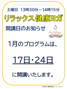 1月のリラックス健康ヨガは以下の日程で行います。 ご確認いただきご参加くださいますようお願いいたします。