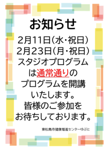 2月11日(水・祝日)、2月23日(月・祝日)の成人プログラムは以下の通りです。 ご確認いただきご参加くださいますようお願いいたします。