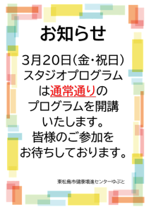 3月20日(金・祝日)の成人プログラムは以下の通りです。 ご確認いただきご参加くださいますようお願いいたします。 ※プールプログラムは休講となります。