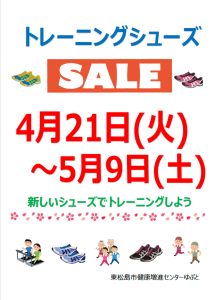 トレーニングシューズセールを4月21日(火)~5月9日(土)まで実施いたします。