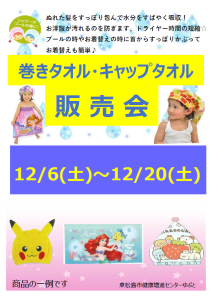 子供向けキャラクター巻きタオル・キャップタオルの販売会を12月9日(土)~12月20日(土)まで実施します。